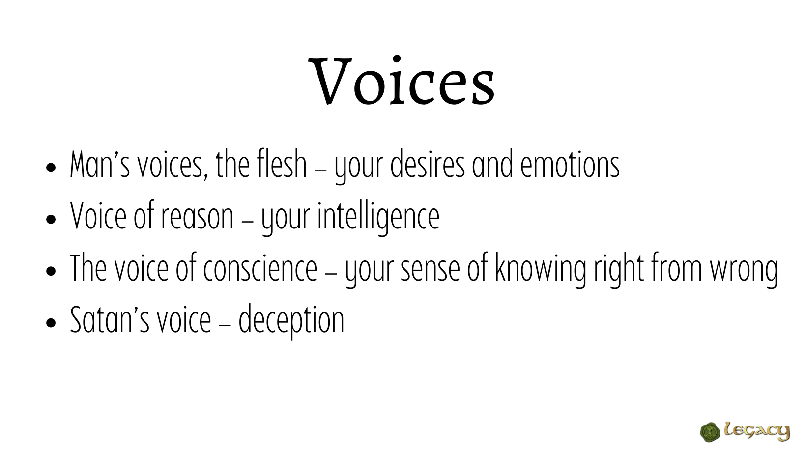 All of these have certain familiarities to them. We are most familiar with our intellect and our conscious. Then our voice or emotions, then satan’s, and finally God’s. As you see God’s voice is at the end and the other voices are entertained. If we create a new order of God’s voice first the outcome becomes; our conscience will submit to it, our intellect will embrace it, our desires and emotions will yield to it, and Satan’s voice will be diminished or gone.